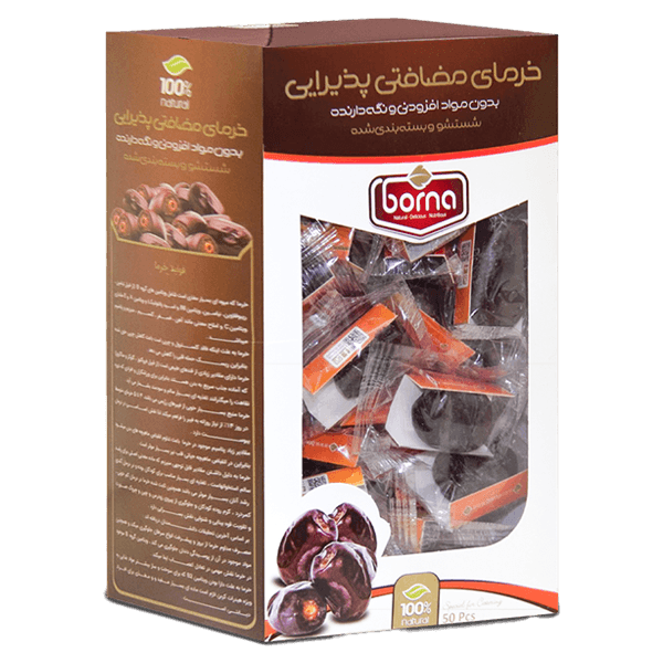 واص حبه خرما: تهیهشده از خرمای خالص و طبیعی بدون هیچگونه افزودنی یا طعمدهنده سرشار از ویتامینهای B، C و مواد معدنی مانند آهن، پتاسیم و م